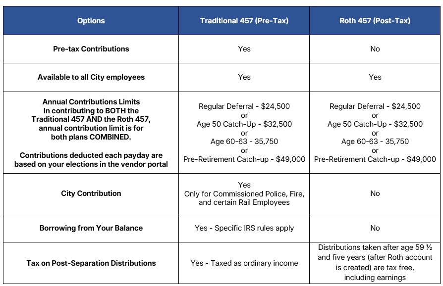 Features of a Deferred Compensation 457(b) Plan:A deferred compensation plan can help bridge the gap between what is available with the City’s pension plan and Social Security, and how much is needed in retirement. Employees can choose to make pre-tax contributions that reduce their taxable income for the year and in turn, those contributions and all associated earnings are not subject to federal tax until withdrawn. There is also an option to make after-tax Roth contributions, which allow for potentially tax-free earnings. Employees may choose to contribute to both the Traditional and Roth plans, however, the annual contribution limit for the Traditional and Roth combined must adhere to the IRS annual maximum limits listed below.