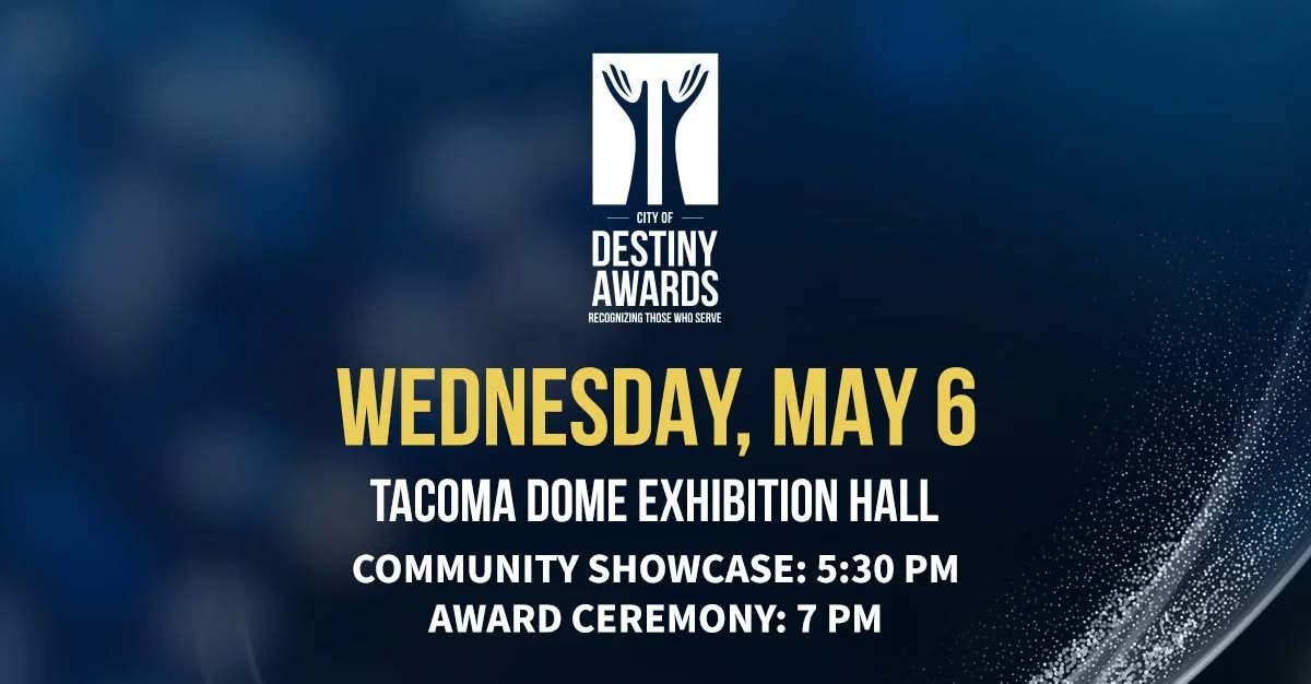 The 2026 City of Destiny Awards is on May 6, 2026, at the Tacoma Dome. Community showcase begins at 5:30 PM and the award ceremony begins at 7 PM. See the award recipients and learn more at http://tacoma.gov/cityofdestinyawards.